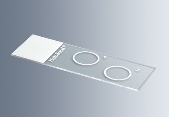 For use in cytocentrifuges we offer our adhesive and positively charged HistoBond®+ slides with white rings. These serve as a microscope help to find the centrifuged cells more easily.