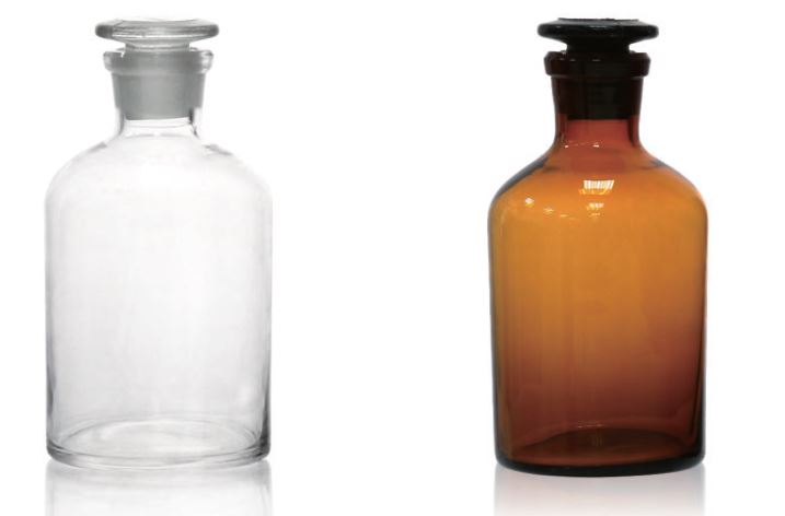 Reagent Bottle, Narrow Mouth with Ground-in Glass Frosted Stopper, Amber Glass, 500ml, Mouth Dia. 33m, External 85x172mm (8/Box)